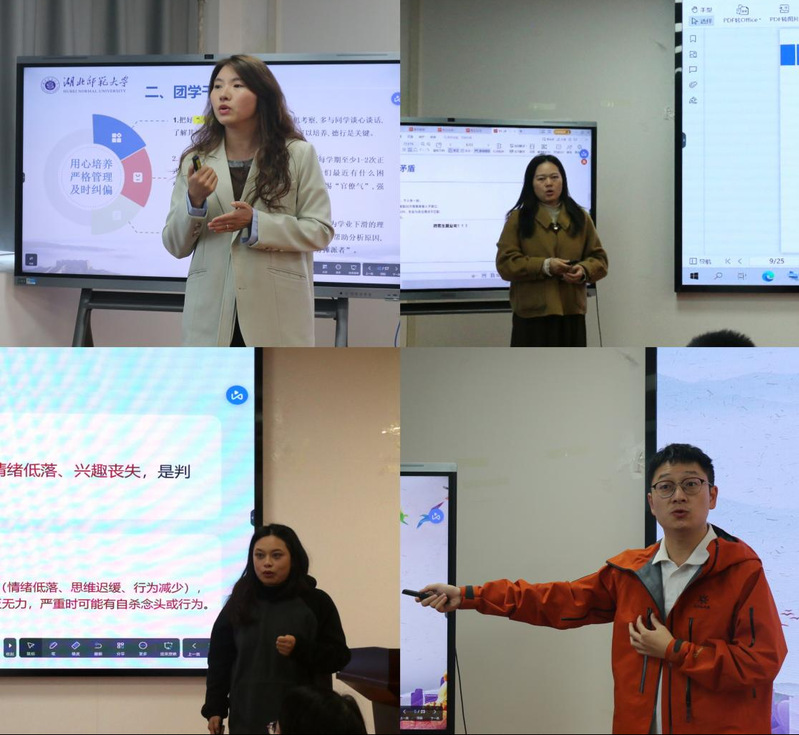 在业务培训环节,袁曼从宏观架构入手,深入阐明了学风建设的创新路径与校园安全管理的底线思维,并就应急事件的处理流程作详细说明;苏梦月阐述了如何通过日常关怀洞察学生心理健康,实现管理与育心的有机统一;屈媛媛聚焦成长支持,详细讲解了“资助”如何与“育人”深度融合,以及学生干部队伍的选拔与培养策略;杨宇森解读了党员发展的规范流程与征兵入伍的激励政策;何金燕分析了当前的就业形势与精准指导技巧。业务培训构成了从思想引领到事务管理、从学业支持到生涯规划的全链条指导,为班主任工作提供了扎实的理论指导和实操借鉴。