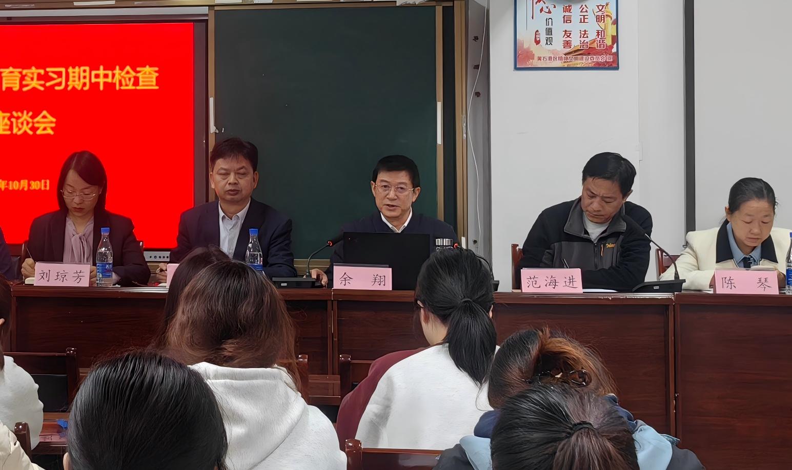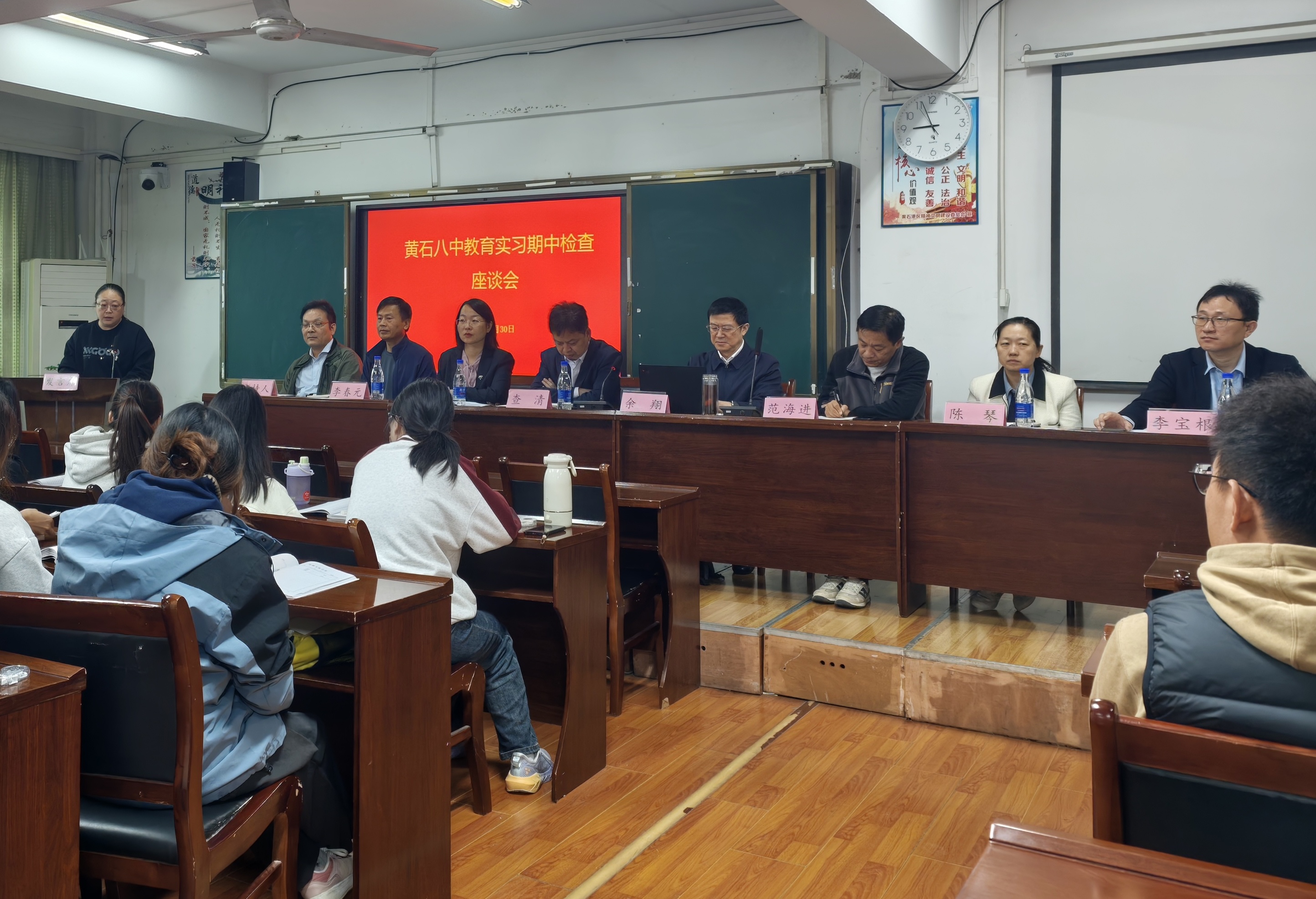2025年10月30日上午,我校副校长余翔率队赴黄石市第八中学开展教育实习检查工作,通过座谈会、师生交流等形式全面了解实习生情况,并就深化校际合作、提升师范生人才培养质量提出指导意见。黄石八中党总支书记查清、校长范海进、副校长李春元,我院党委书记刘琼芳、副院长陈琴、系主任李宝根及指导教师代表、全体实习生参与活动。会议由黄石八中教务主任黄勇主持。