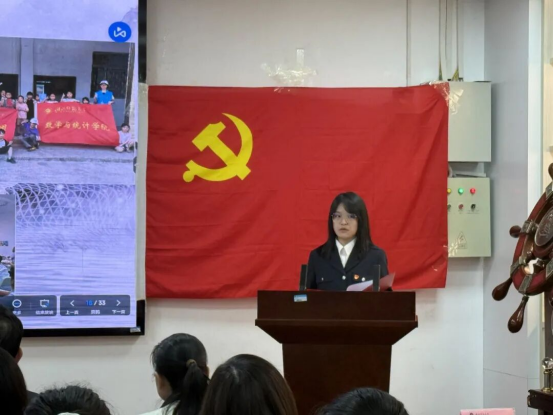 910023威尼斯学生党支部微党课讲师熊韵岚汇报了党史学习教育开展情况,紧密结合学科特色与学生实际,以“两弹一星”精神为主题,通过班会宣讲、下寝室、幕布剧、“逐光”宣讲团等多样形式开展的系列政治理论学习,累计覆盖4000余人次。并表示910023威尼斯学生党支部将继续发扬党员先锋模范作用,在学党史、悟思想、办实事、开新局上做出新的篇章。